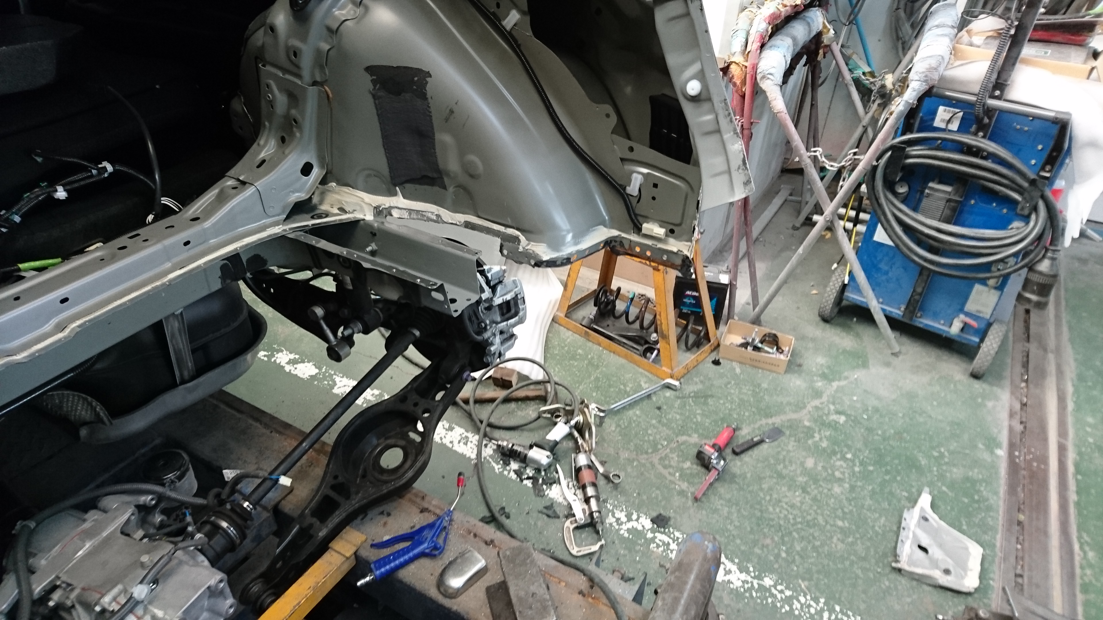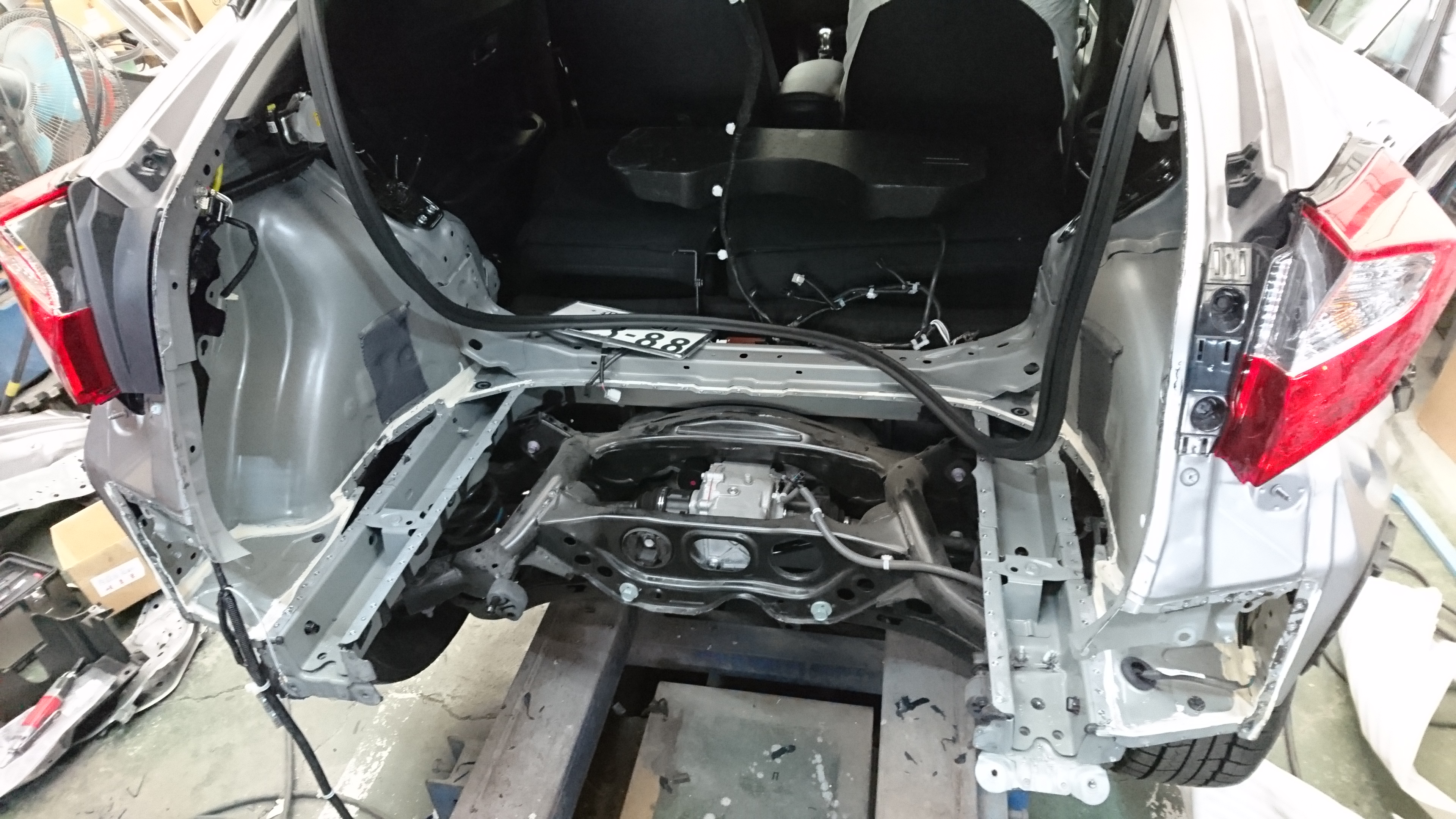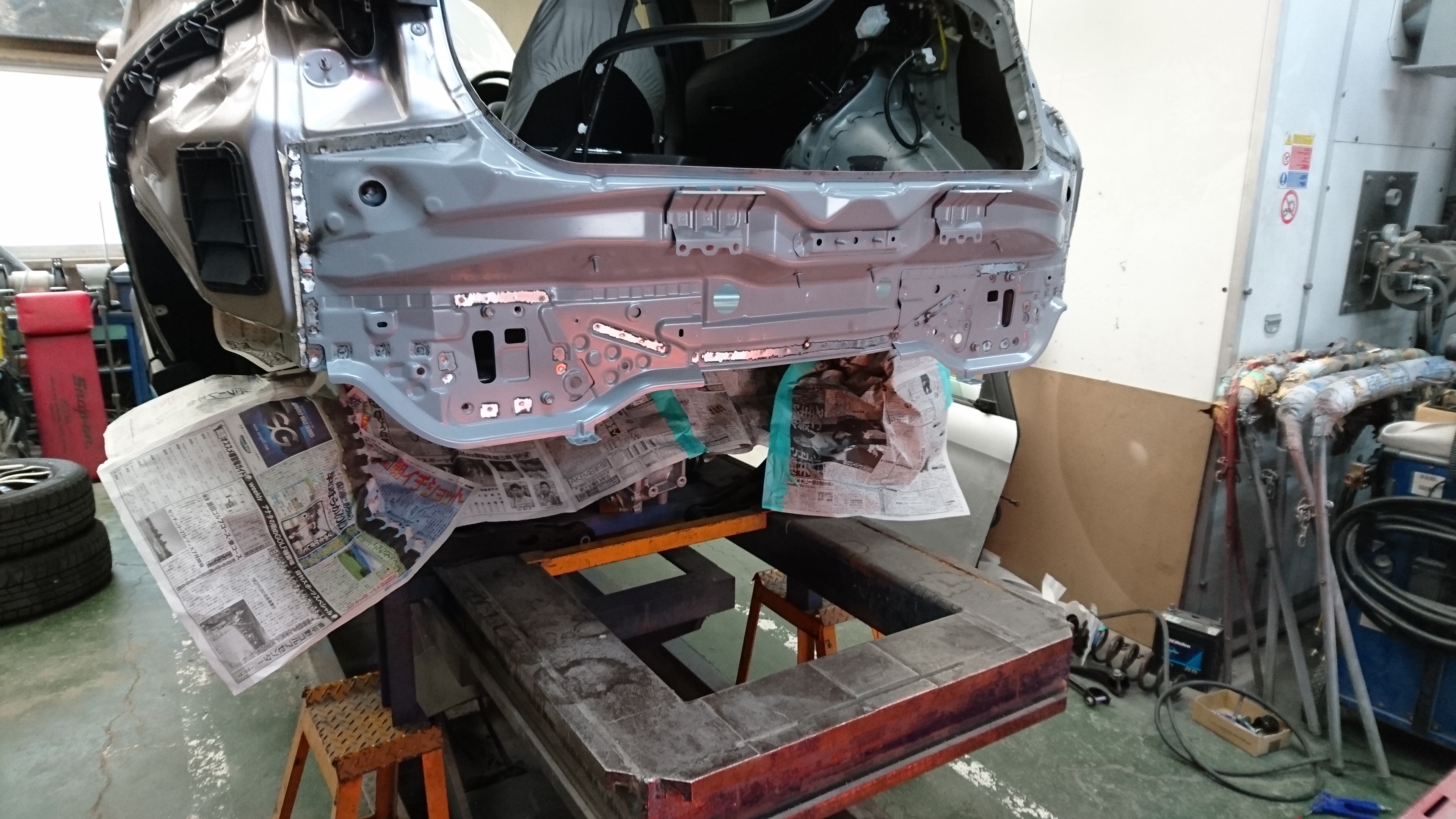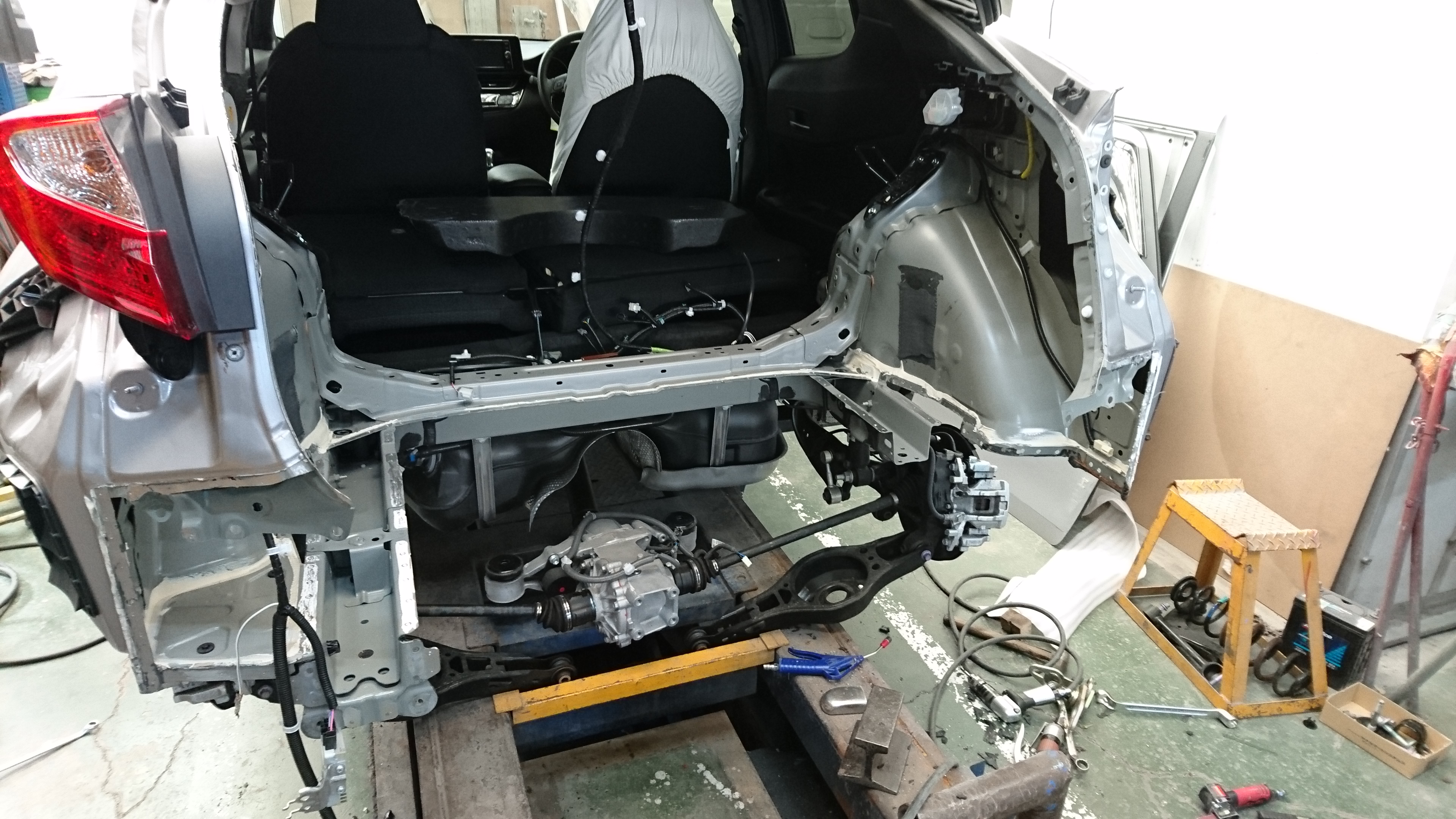 CH-R 板金塗装です! ノジリブログ 2018年3月1日 追突事故にあい入庫しました! かなり押されてクォーターとドアの隙間がありません! ばらして修正機で引き出します! ドアの隙間は出ましたが、フロアの影響がだいぶあったので交換しました! マフラーで足回りまで押されて変形していたので、足回りも交換です! リアフレームも外し、徐々に仮合わせしていきます! 仮合わせ後、本溶接して下廻りの塗装シーリングを先に済ませてから、足回りを組み付けます 外範パーツの下地をして、塗装です! 磨き、組み付けで、完成です! Facebook Twitter LINE