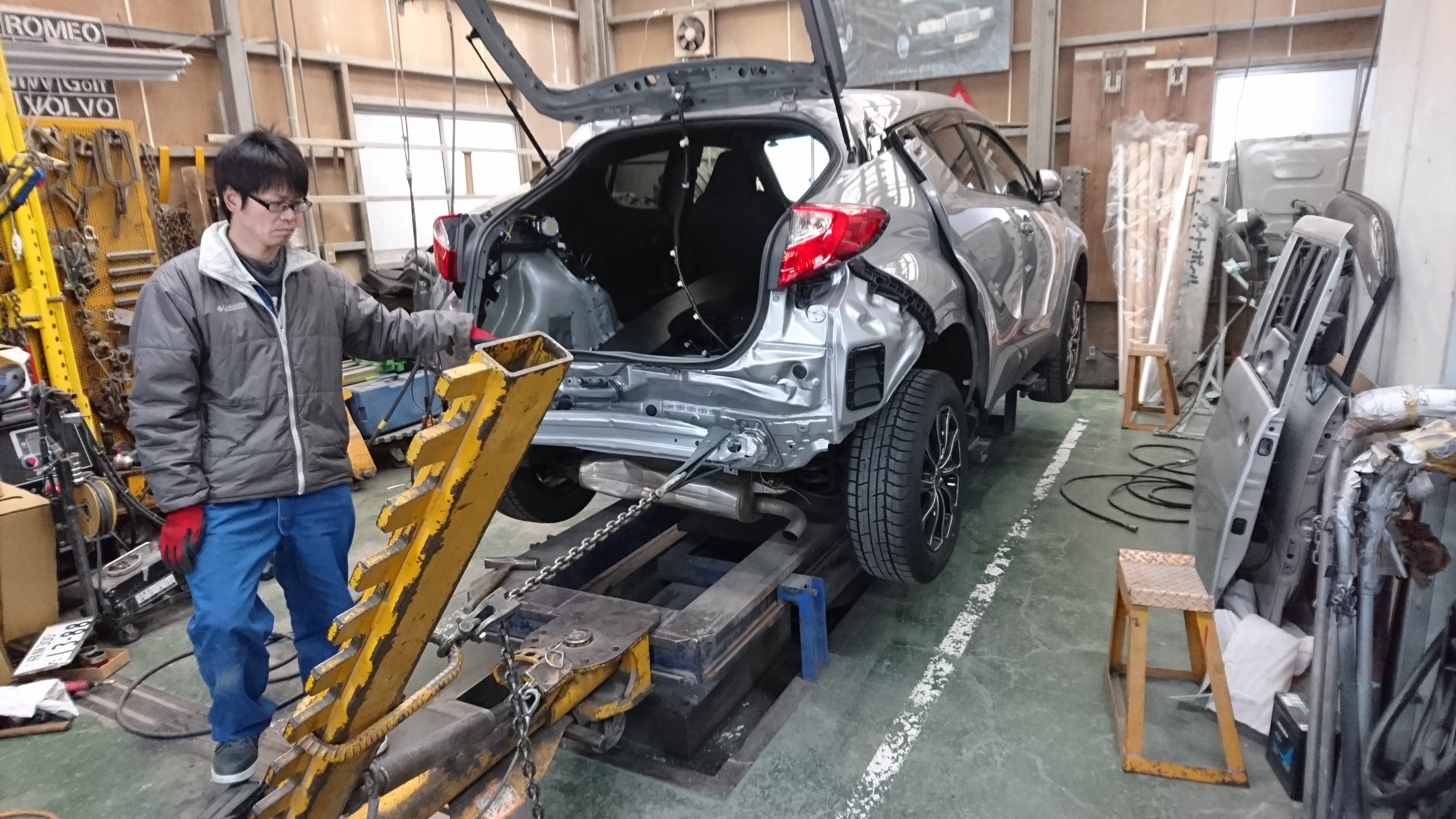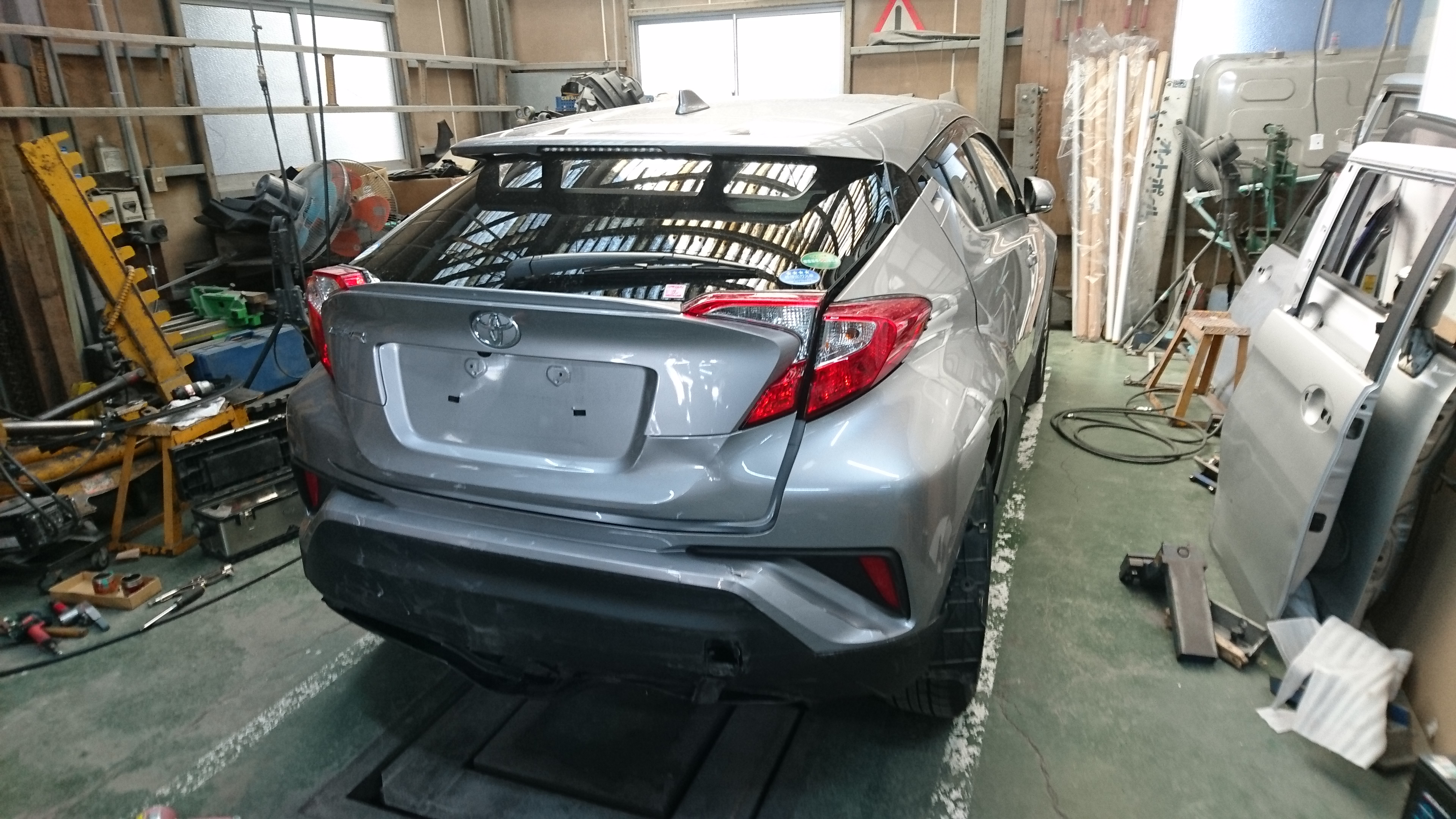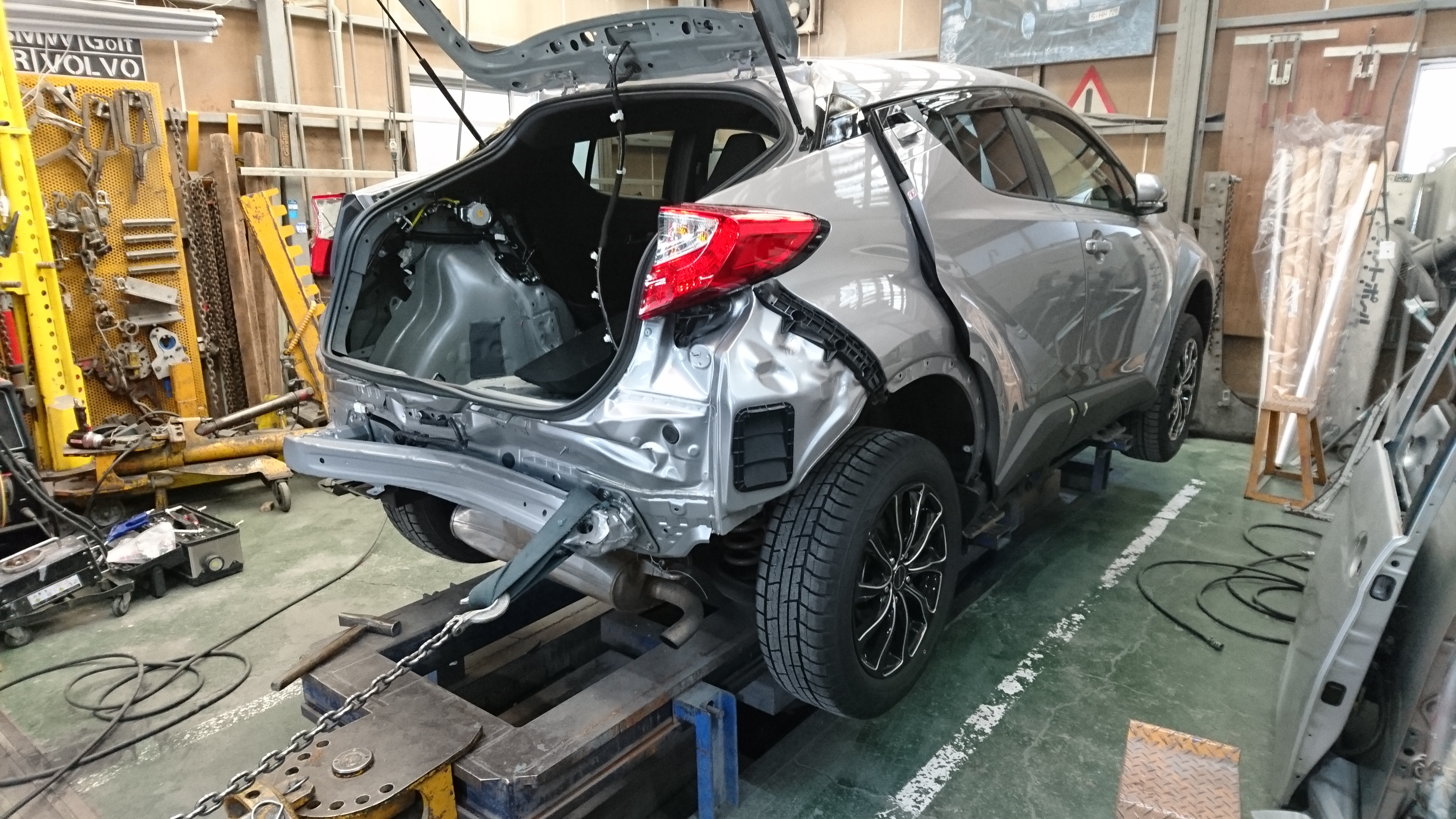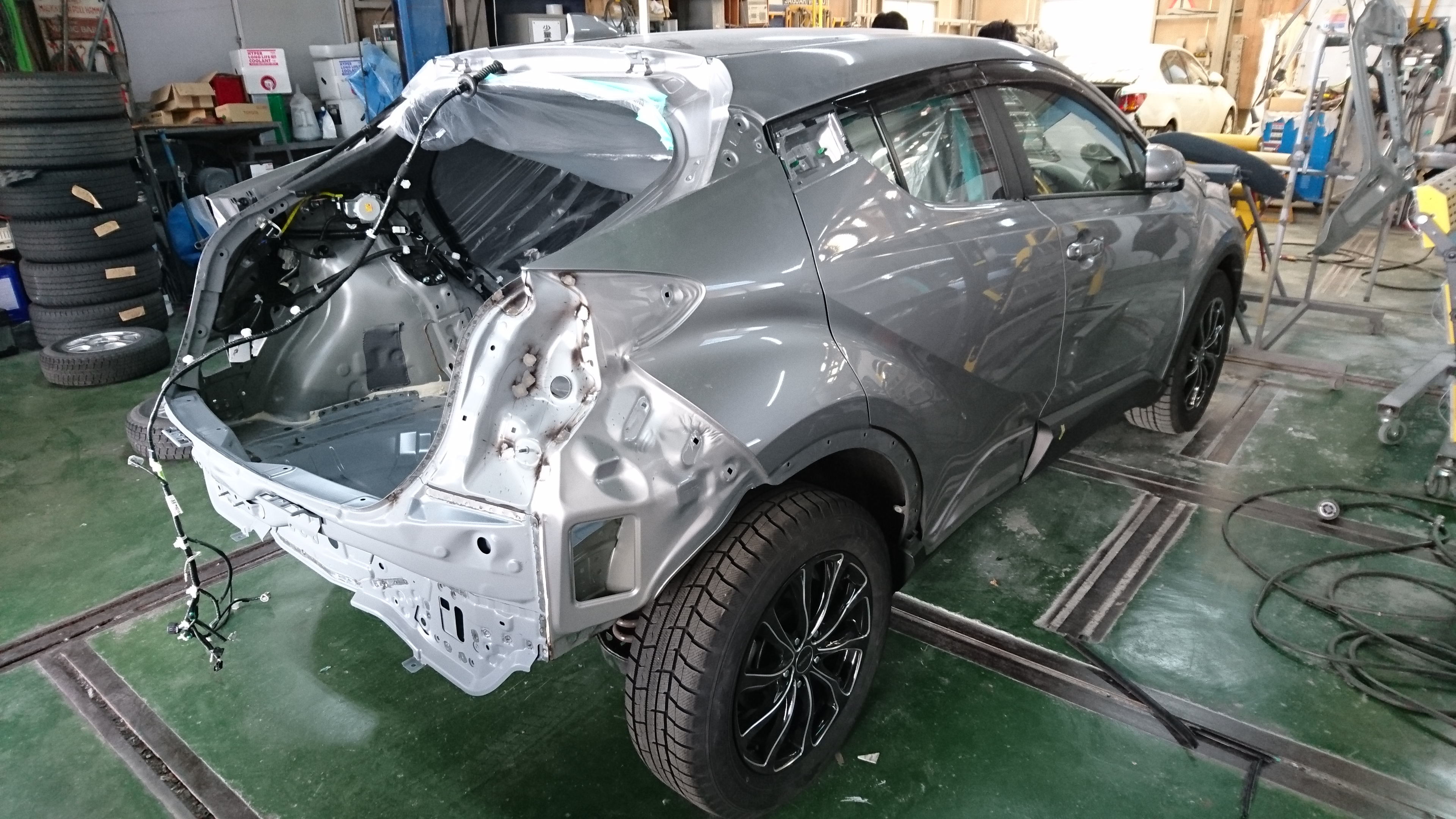 CH-R 板金塗装です! ノジリブログ 2018年3月1日 追突事故にあい入庫しました! かなり押されてクォーターとドアの隙間がありません! ばらして修正機で引き出します! ドアの隙間は出ましたが、フロアの影響がだいぶあったので交換しました! マフラーで足回りまで押されて変形していたので、足回りも交換です! リアフレームも外し、徐々に仮合わせしていきます! 仮合わせ後、本溶接して下廻りの塗装シーリングを先に済ませてから、足回りを組み付けます 外範パーツの下地をして、塗装です! 磨き、組み付けで、完成です! Facebook Twitter LINE