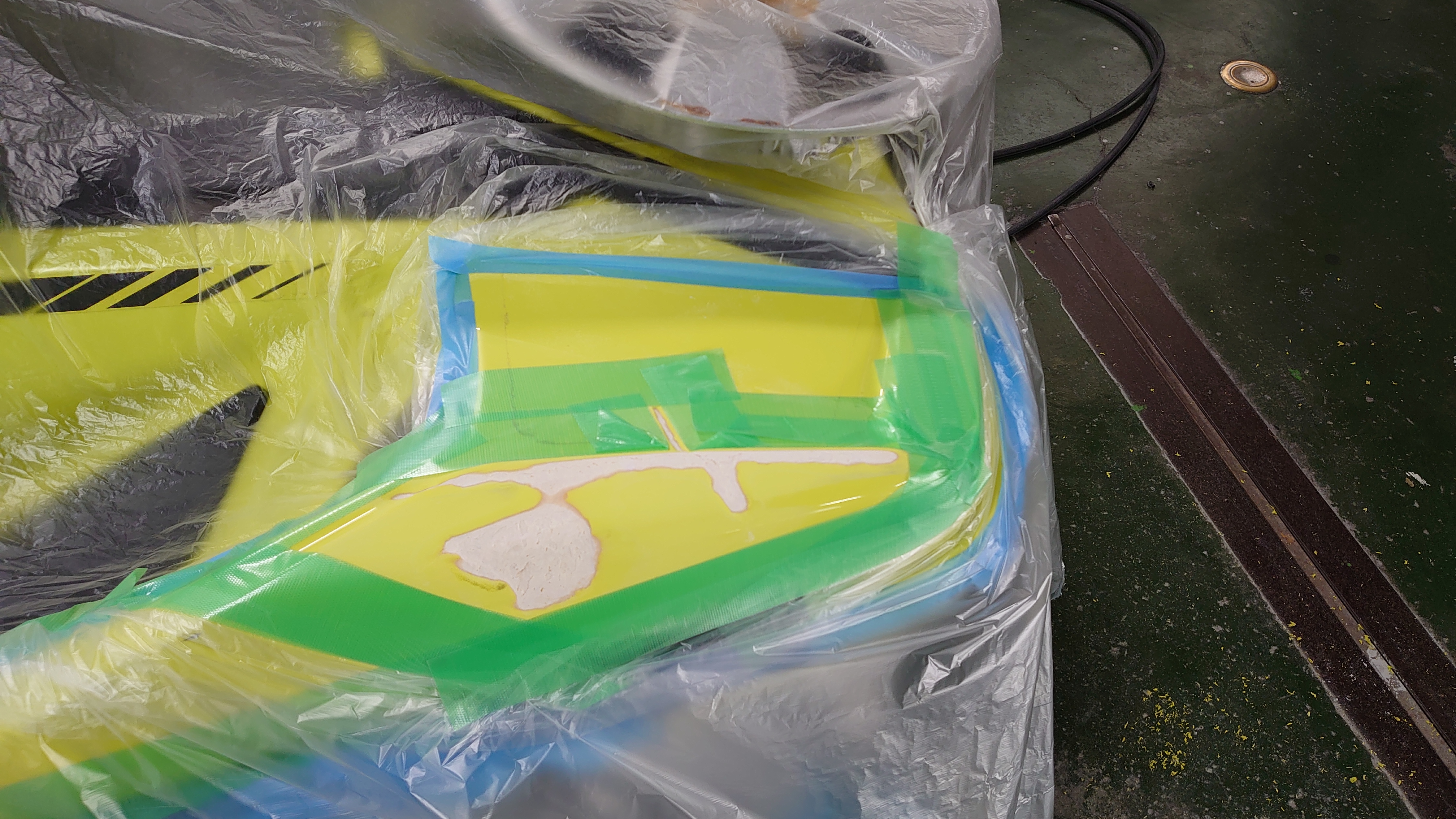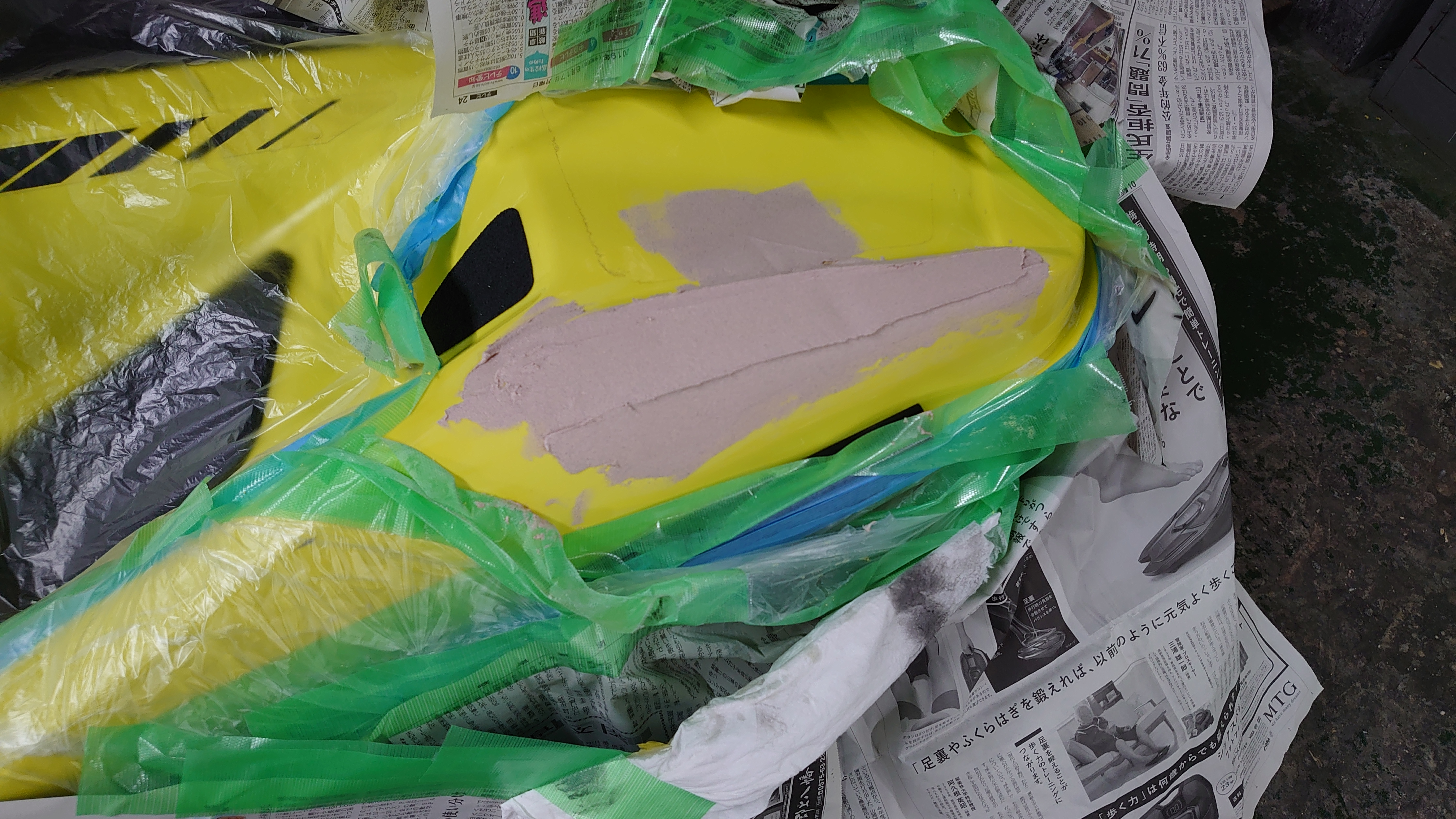 プラスチックの表面部を削るとFRPの下地が出てきましたが、ぶつかった衝撃で中がグサグサになってしまった為、削るだけ削り込み、不飽和ポリエステル樹脂にてFRPに染み込ませて、下地のベースを作りました。