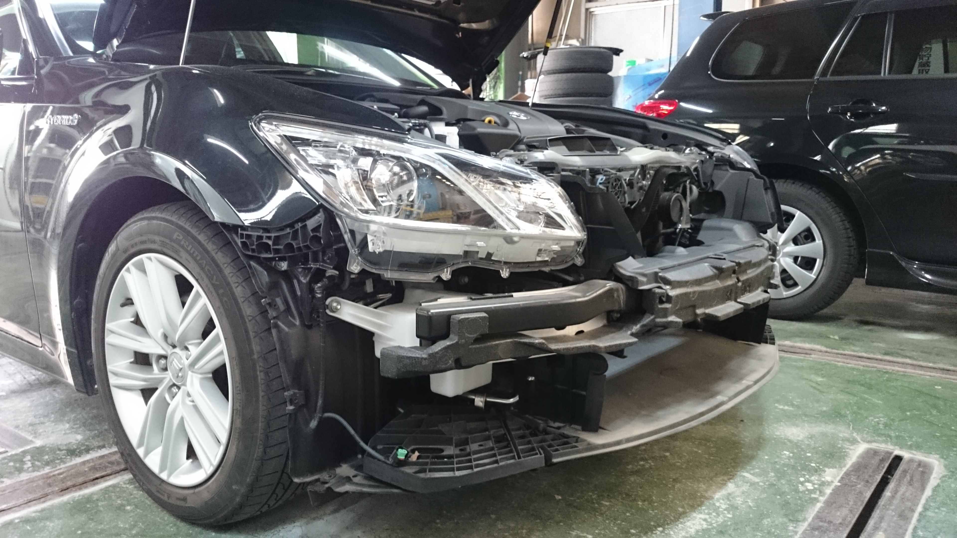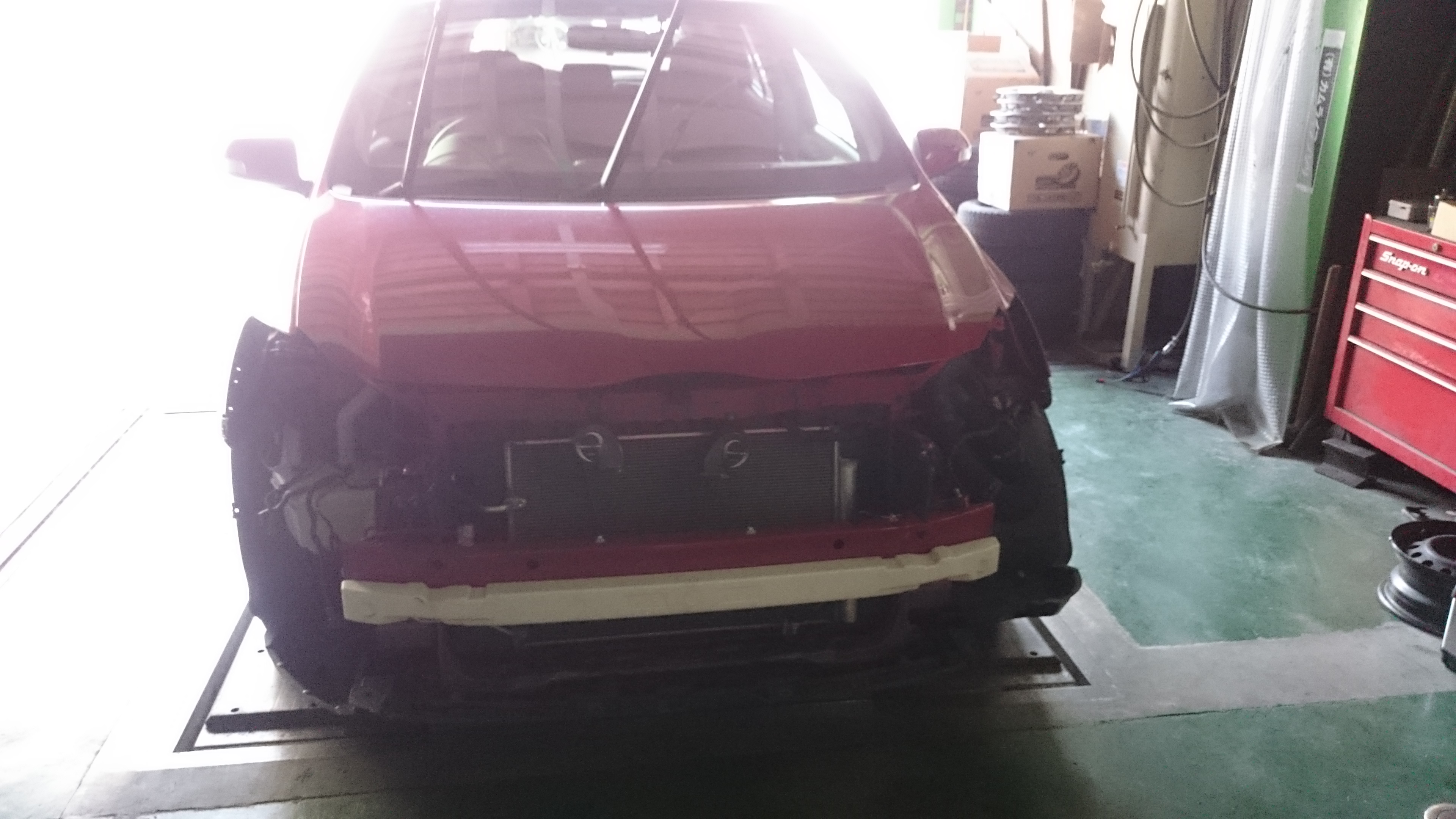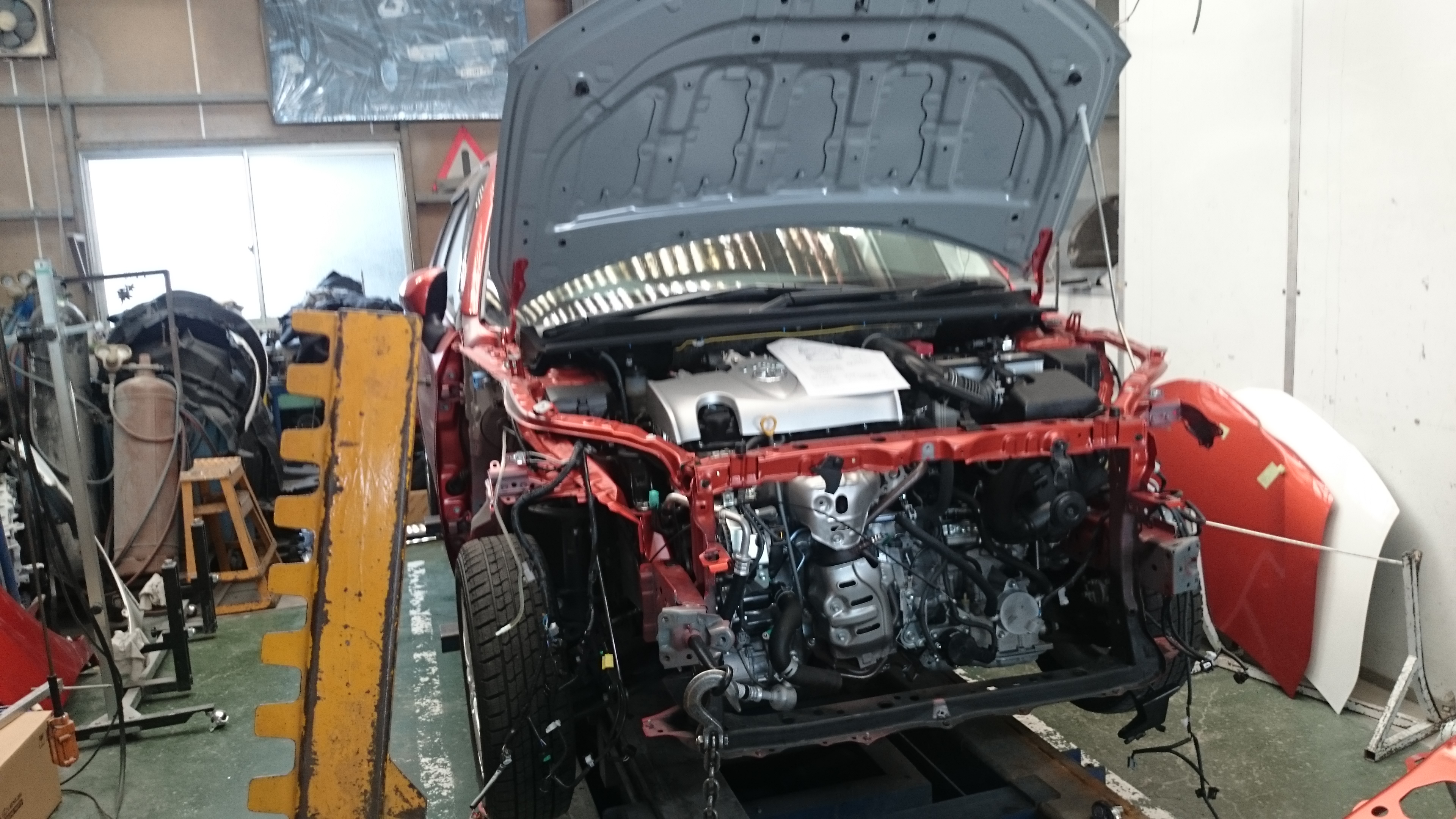 寸法図を参考にしながら、フレーム修正をして、コアサポート一式を新品に交換して、ボンネット、フェンダー、ヘッドランプ、バンパーを合わせて、隙間、出具合の調整をして、本溶接です!