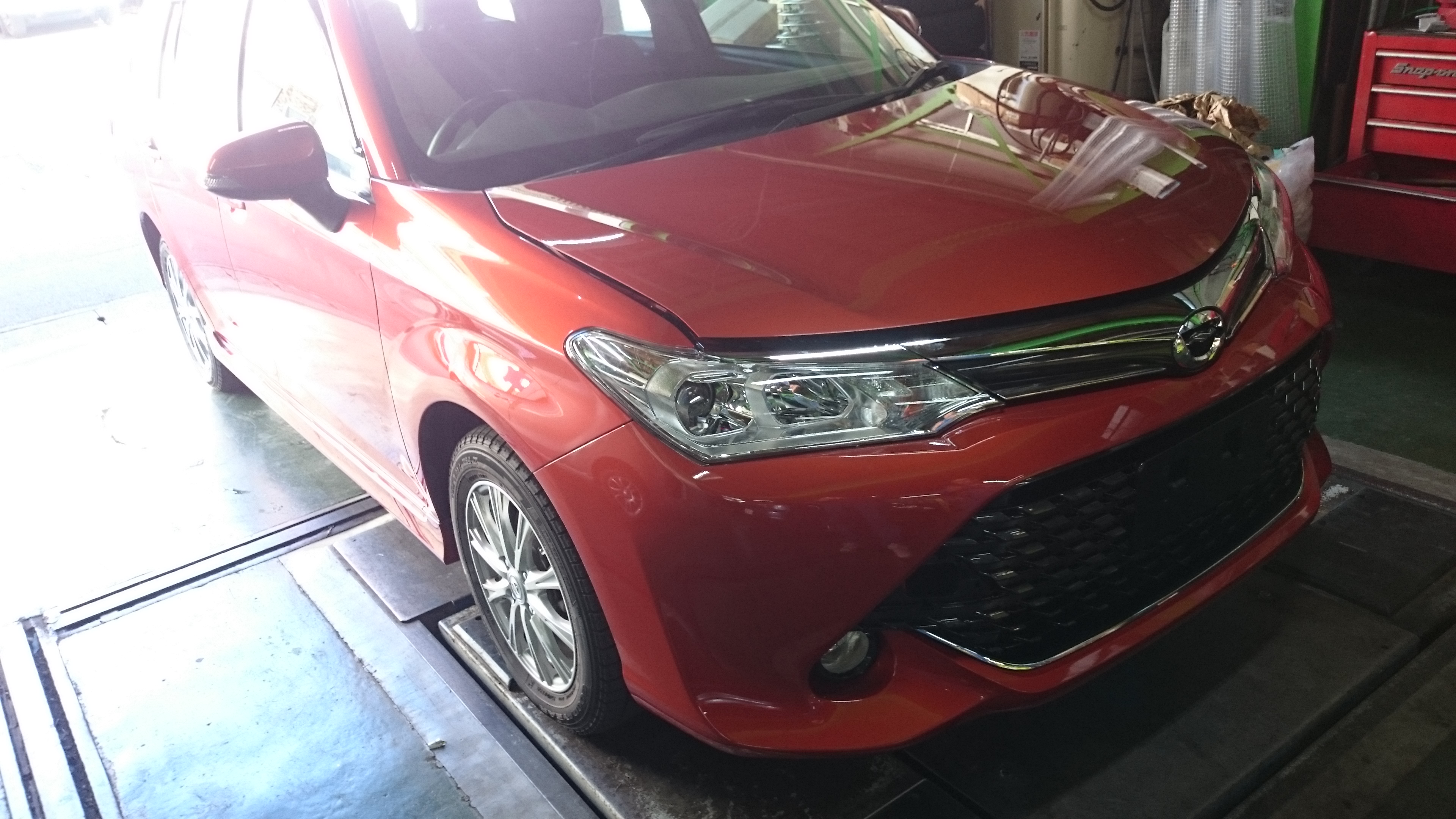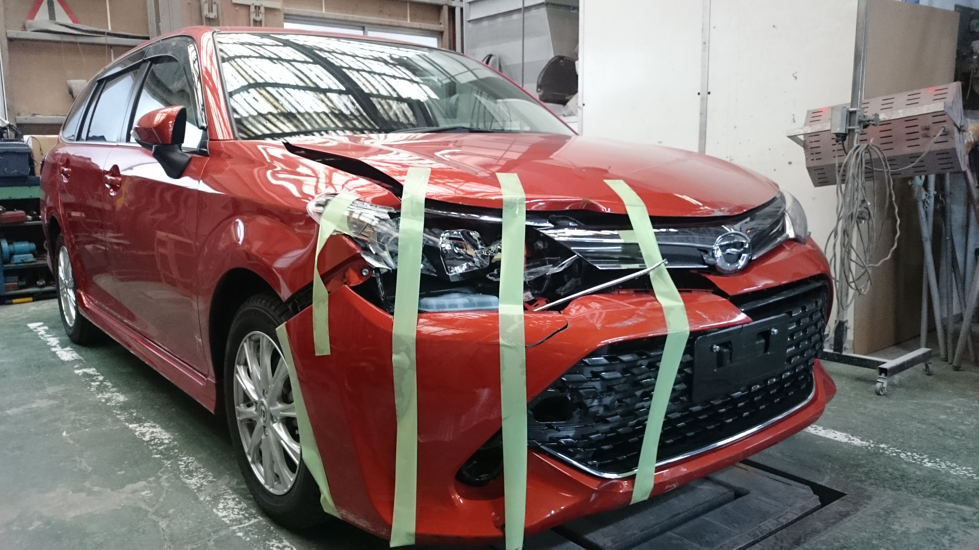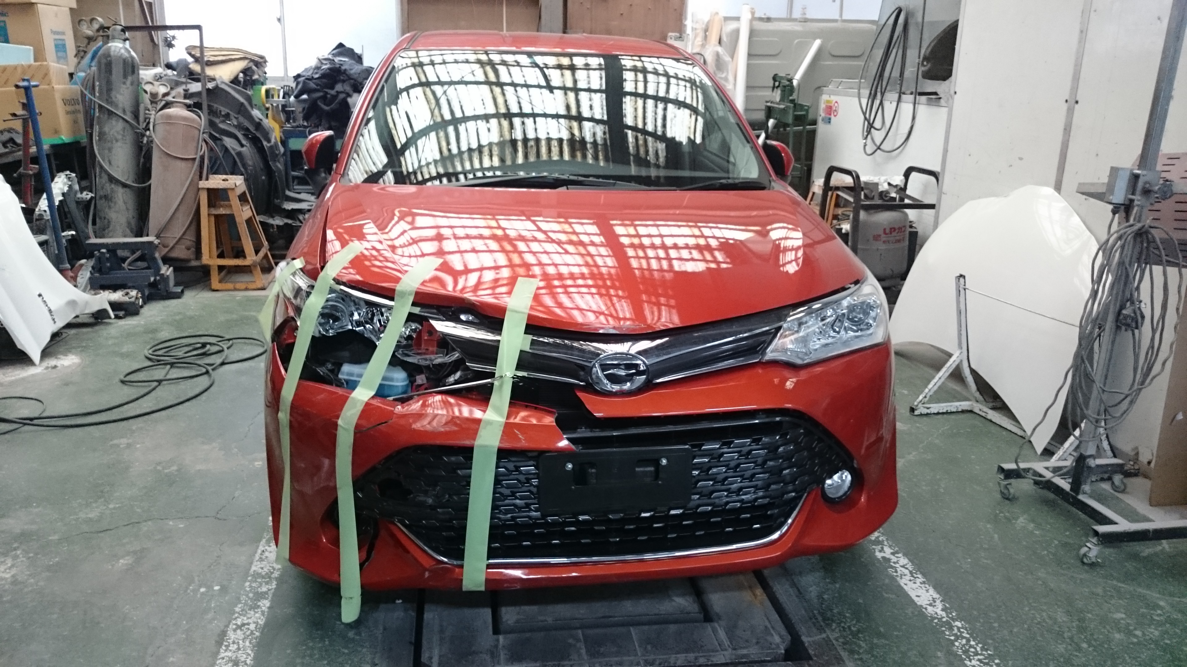 寸法図を参考にしながら、フレーム修正をして、コアサポート一式を新品に交換して、ボンネット、フェンダー、ヘッドランプ、バンパーを合わせて、隙間、出具合の調整をして、本溶接です!