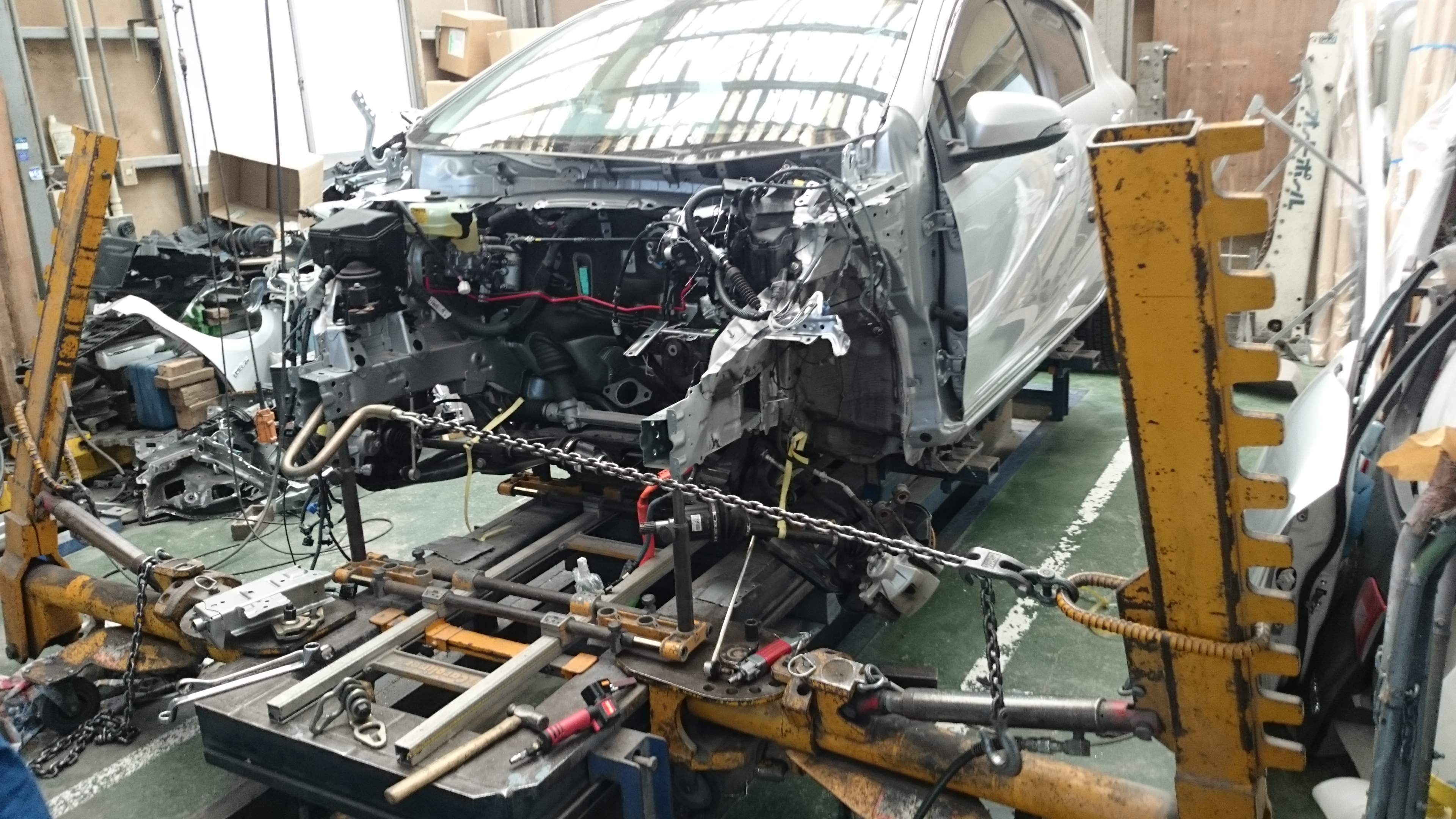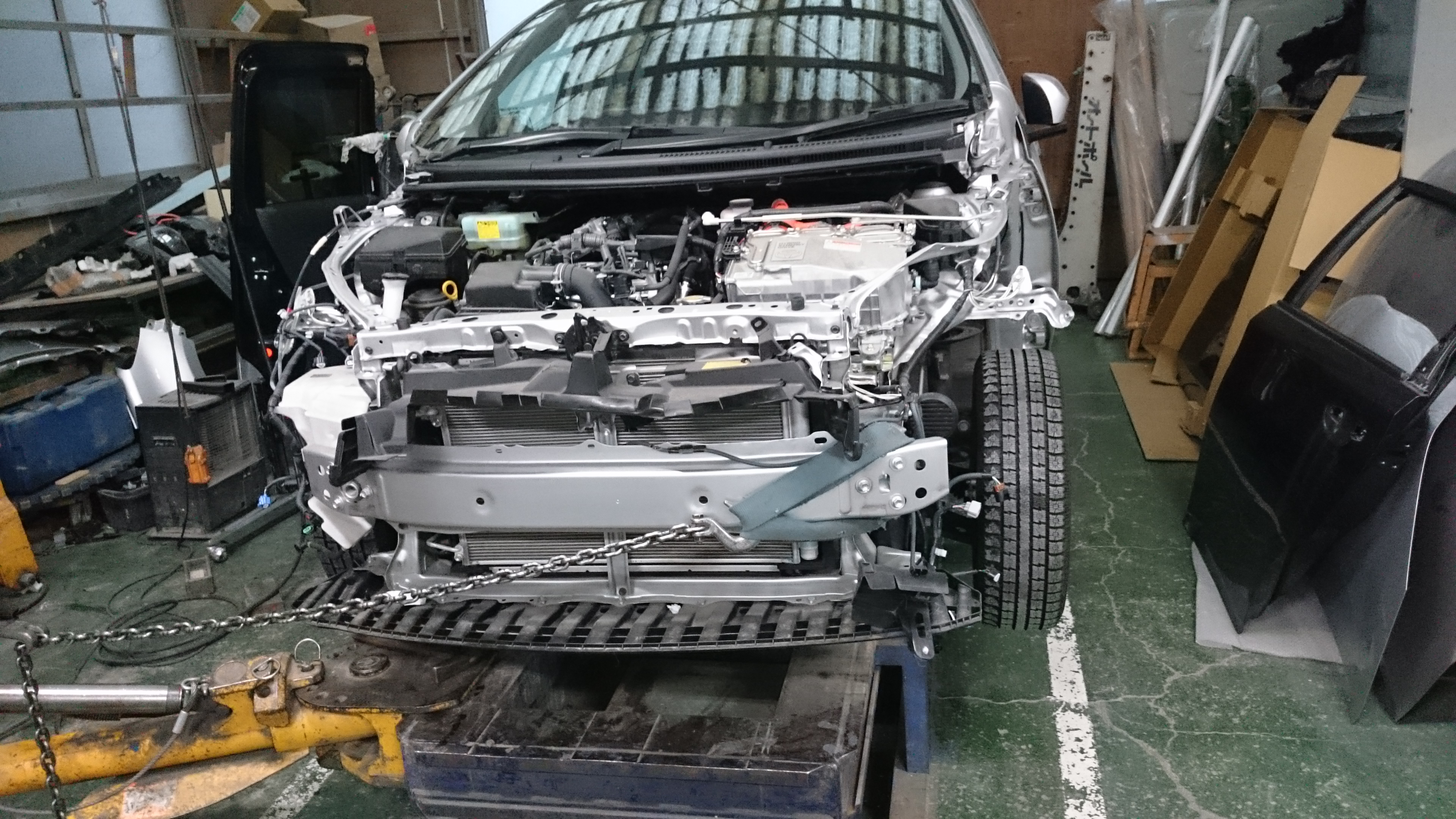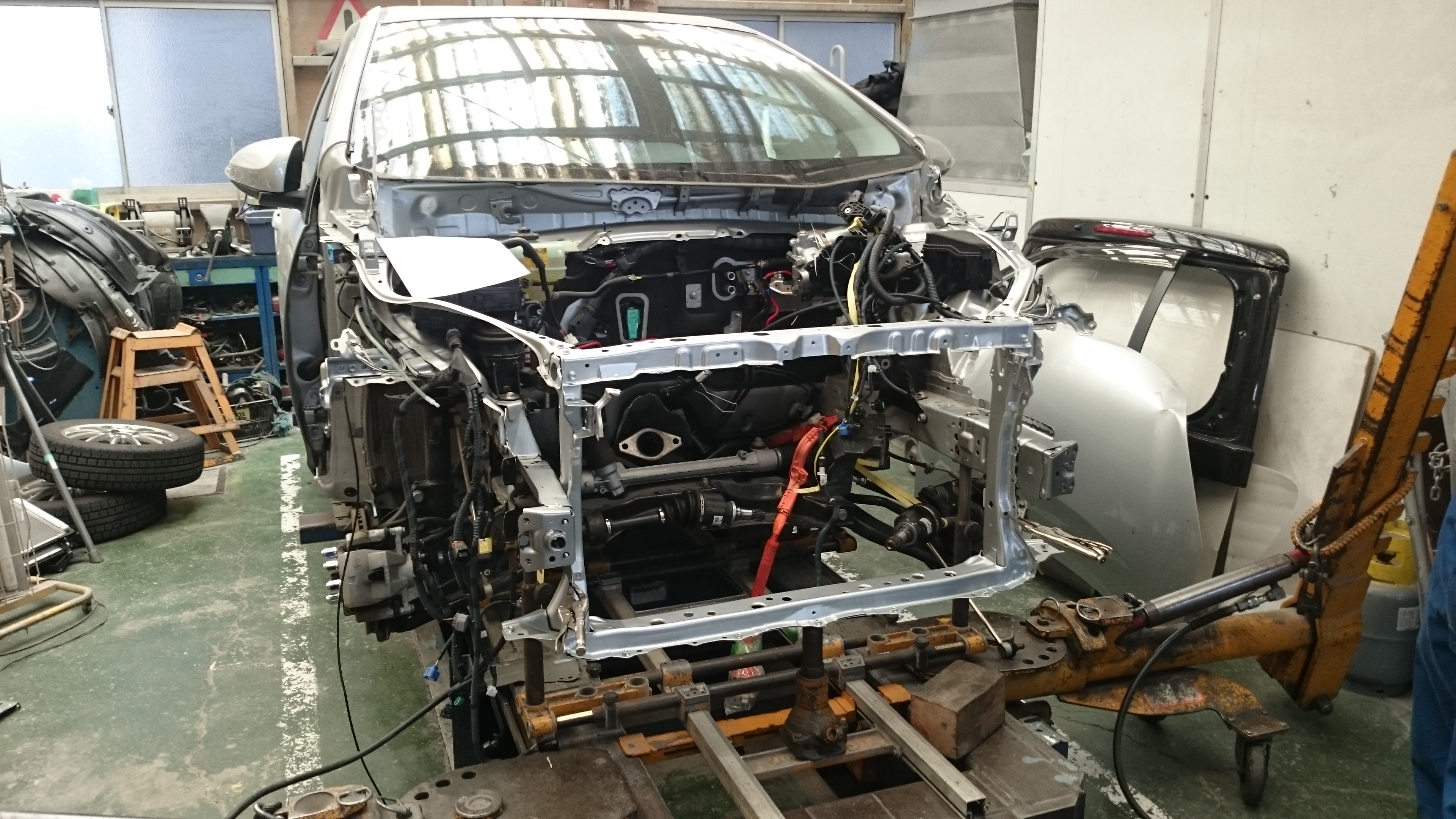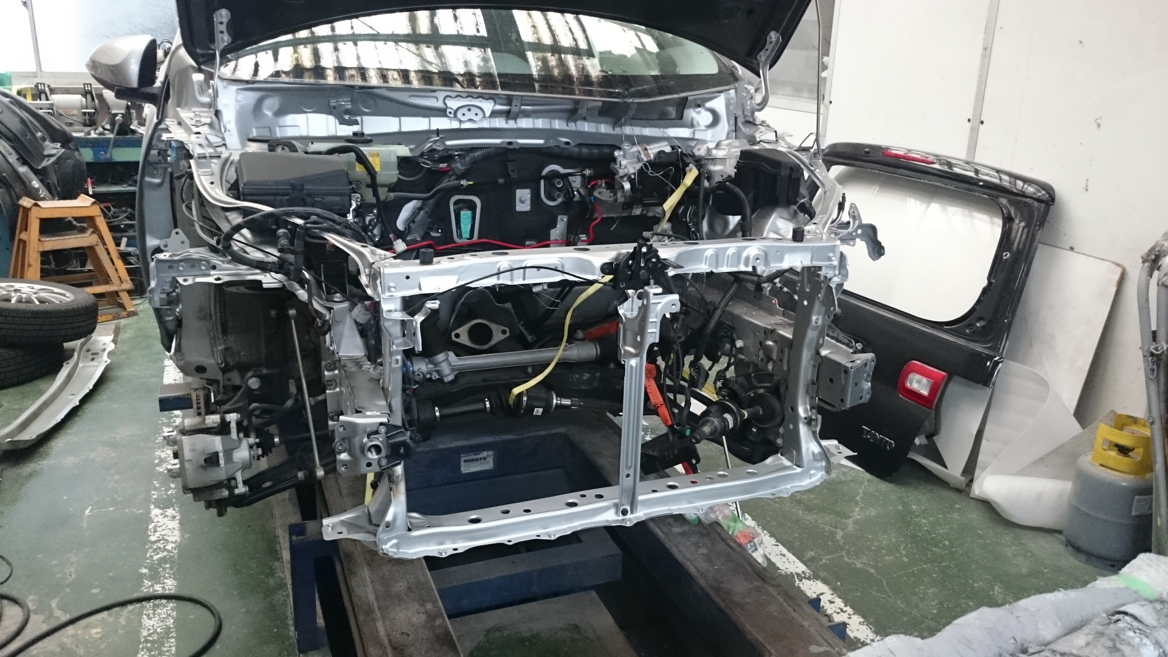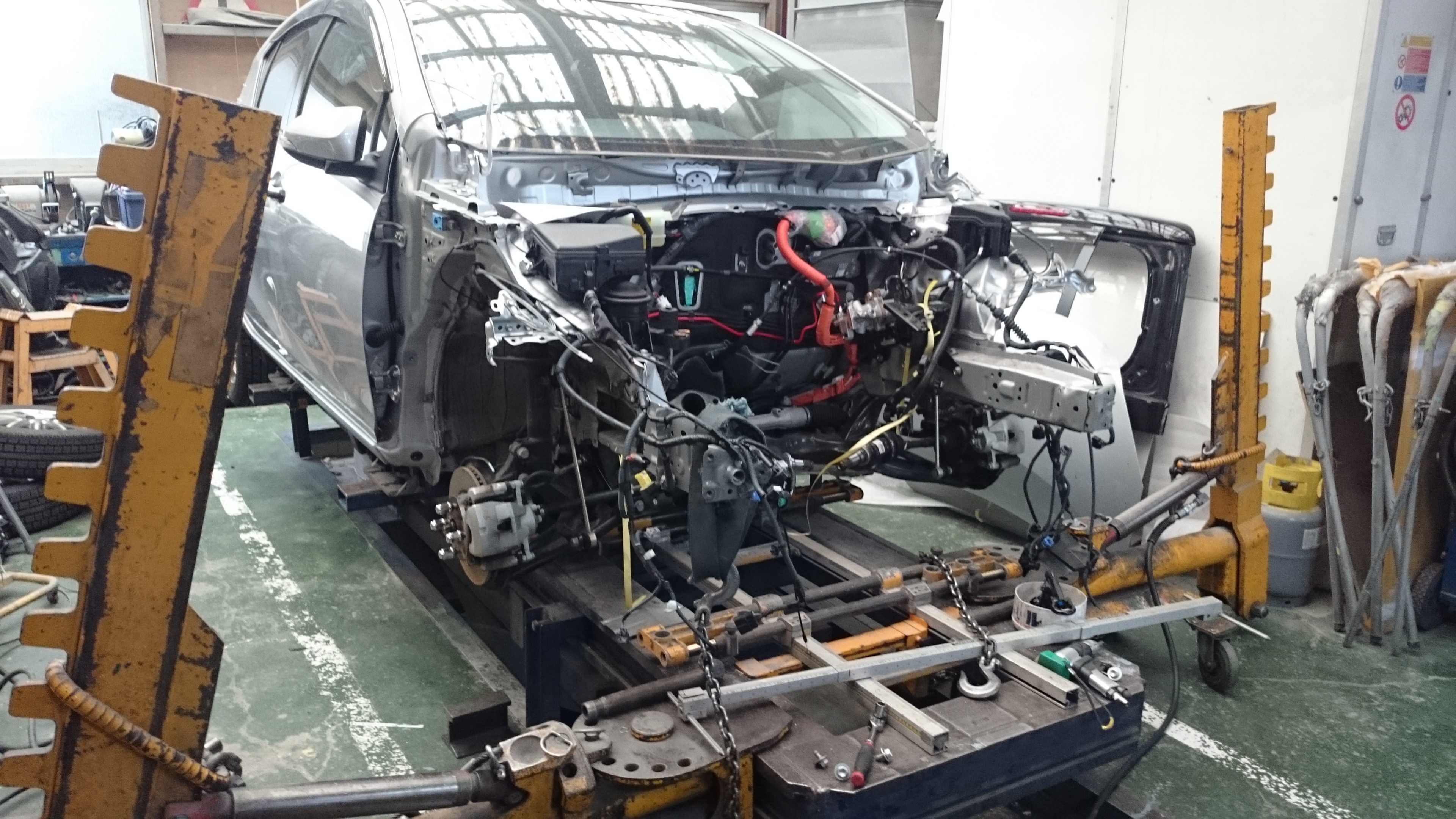 今回は根本のフレームや、ハイブリッドシステムの下の方に影響が出ていたので、粗方引っ張りエンジン、ハイブリッドシステムを下ろすことにしました!